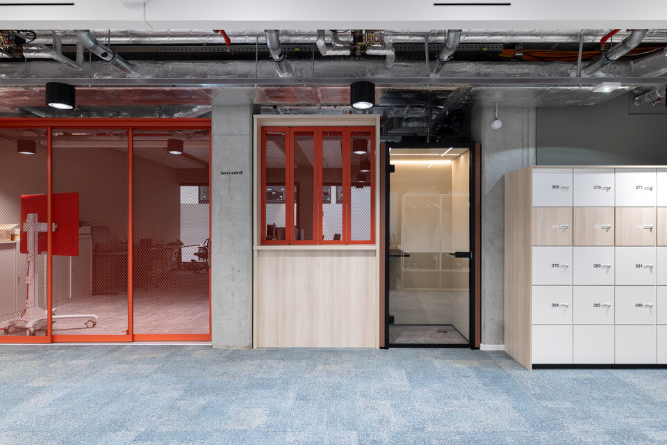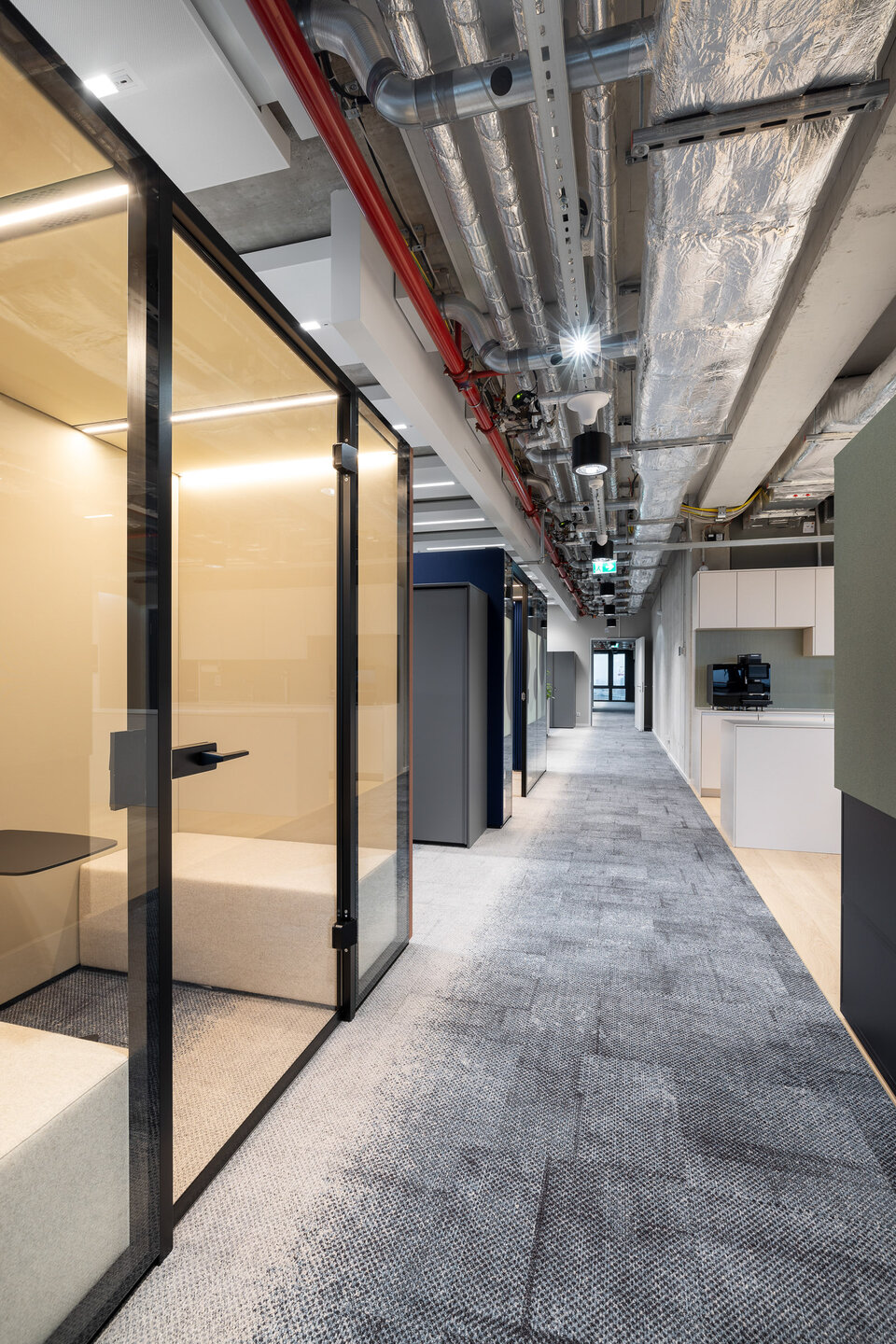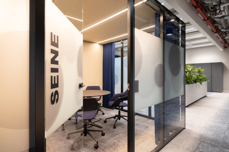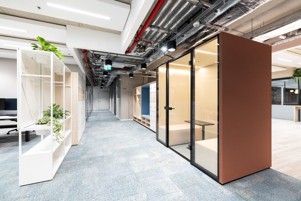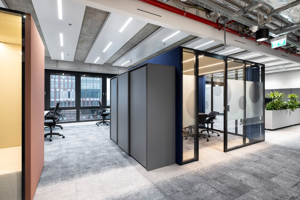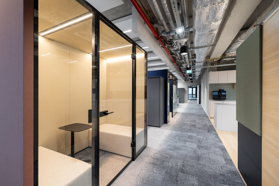 Ergänzend wurden aus dem CAS Rooms Flow verschiedene Sitznischen entwickelt, die eine alternative Nutzung der Büroflächen ermöglichen. Alle Flow Module wurden in individuellen RAL Sonderfarbtönen und dazu passenden Textilien umgesetzt, die in der zurückhaltenden Farbgestaltung des Gesamtambientes gezielt Akzente setzen.
