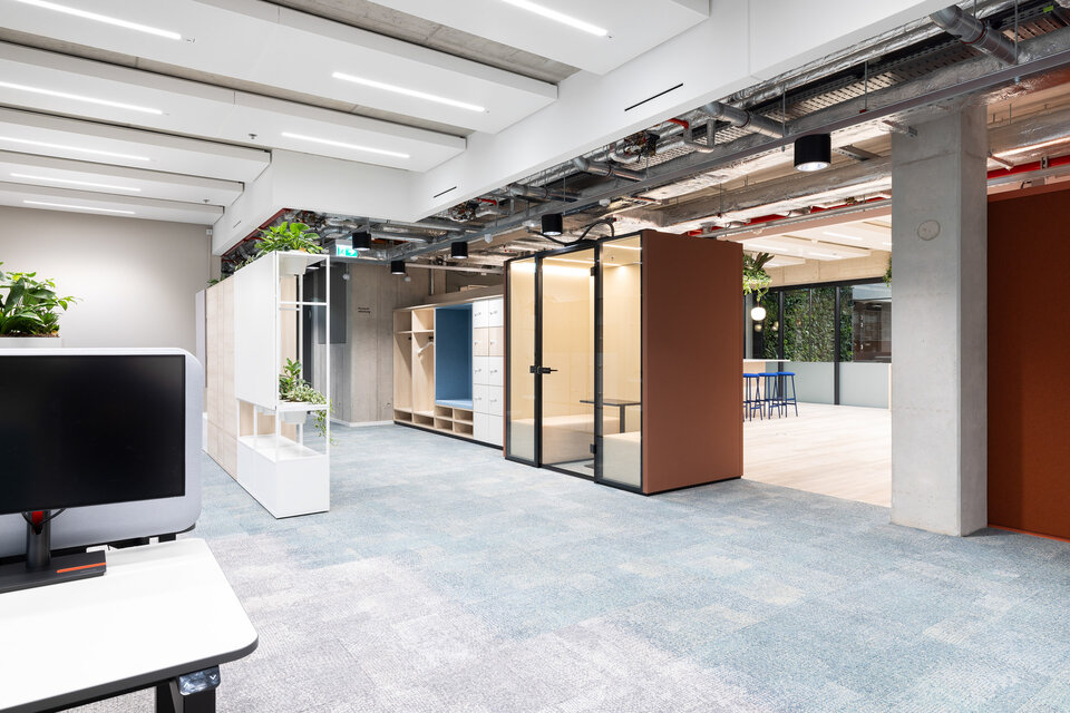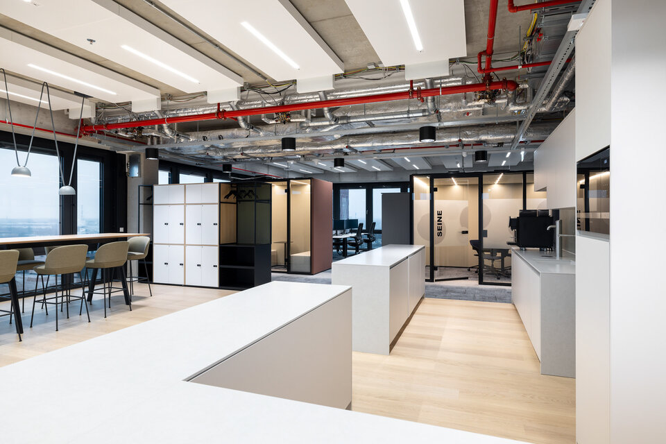 Statt klassischer Bürostrukturen erstreckt sich auf 5.700 m² und drei Etagen eine offene, lichtdurchflutete Arbeitswelt – sogenannte Work-Life-Spaces. Kurze Wege und eine durchdachte Arbeitsplatzstrategie für 220 Arbeitsplätze fördern Kommunikation, Begegnungen und eine hohe Aufenthaltsqualität.