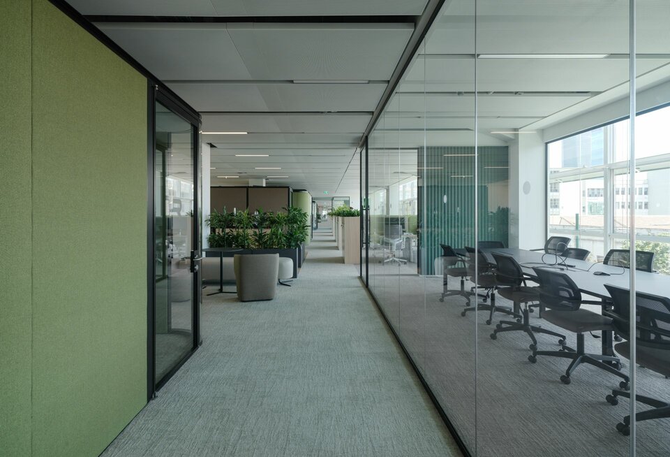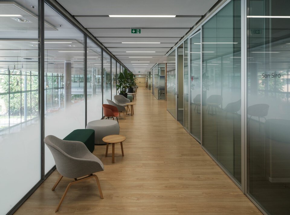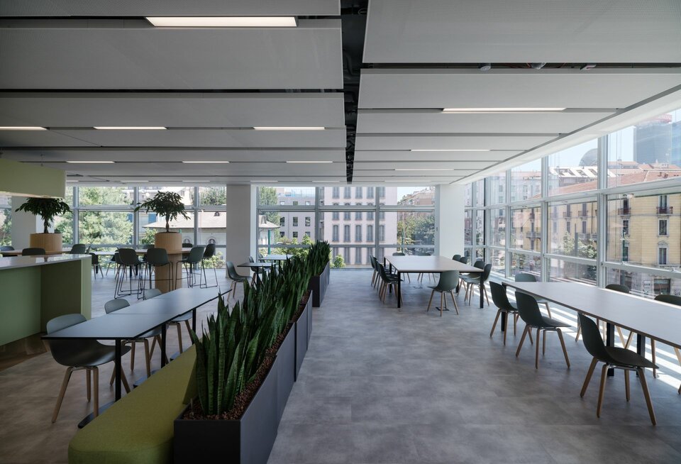 Die Lindner SE trug mit der Lieferung zahlreicher Systemprodukte im Gebäude eine große Rolle beim Bau der Via Monterosa 91 bei. So wurden im innovativen Bürokomplex rund 17.000m2 LMD-DS Metalldeckensegel installiert, welche dank MOODline Oberflächenbeschichtung ästhetische Eleganz mit funktionalem Nutzen verbinden. Die Cradle to Cradle Certified® Deckensegel wurden dabei in maximaler Größe verbaut und tragen maßgeblich zur Flexibilität in der Raumgestaltung bei. Abgerundet wird das Projekt durch 160 Leuchten des Typs LK 73: Diese sorgen dank Opal-Diffusor für ein angenehmes Ambiente in der Business School.