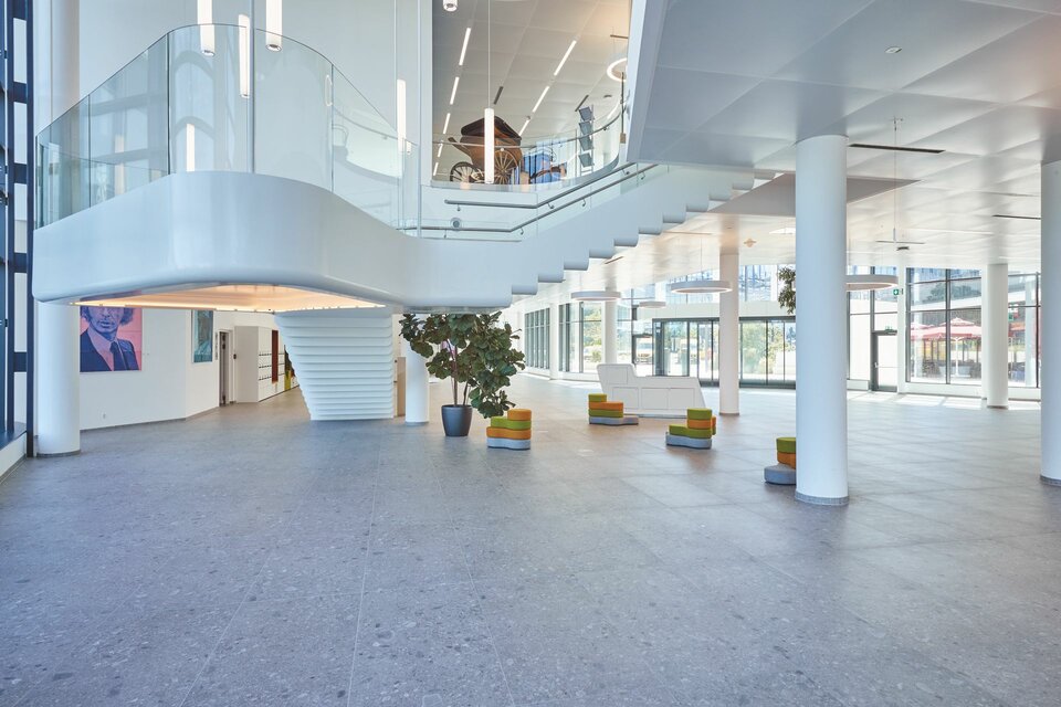Lindner war 2019 bis 2020 als Generalunternehmen in das Projekt involviert und setzte den Innenausbau mit seinen Geschäftsbereichen Trockenbau, Decke und Boden unter Berücksichtigung höchster Energiestandards um. Bei der Verlegung der Doppelbodensysteme wurden besonders emissionsarme Kleber und Platten verwendet.