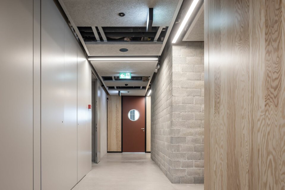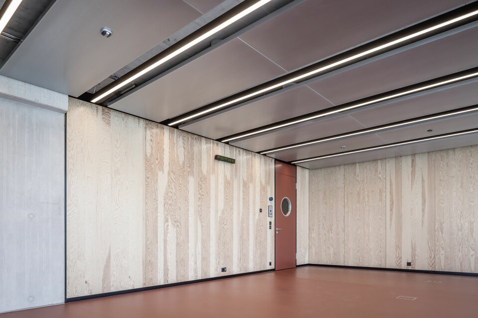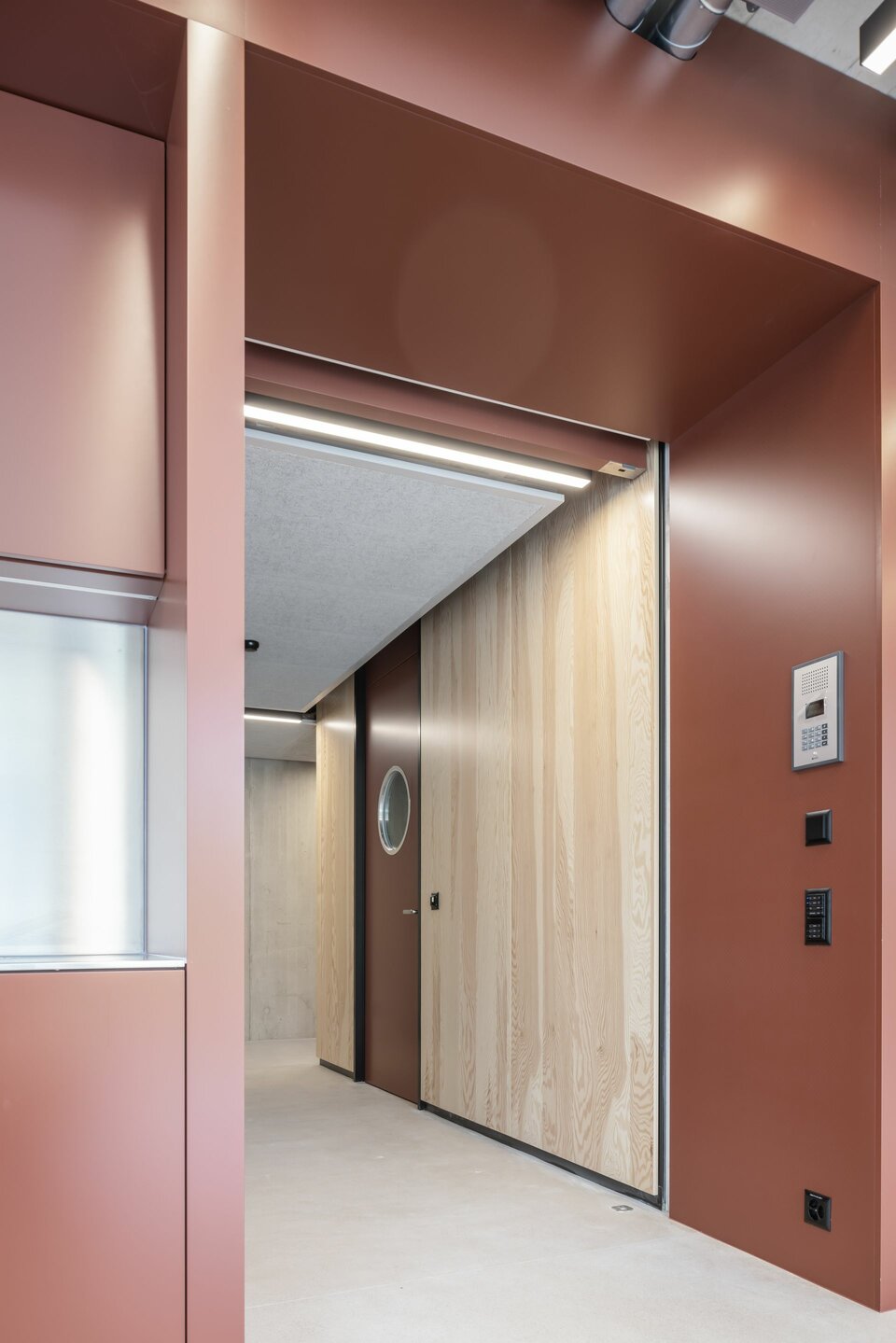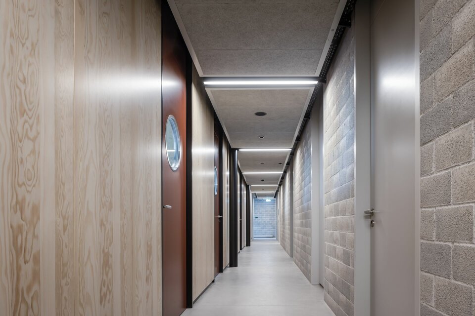 Hier war Lindner für sämtliche Büro- und Sitzungswände inkl. der Türanlagen, zum Teil mit Sicherheitszugängen und intergerierten Schalterpanels zuständig. Dabei wurde das Design der Oberflächen an den schlicht funktionalen, ruhigen Material- und Farbmix angepasst. Neben rot lackierten Holztüren, die speziell mit Bullaugenfenstern gefertigt wurden, finden sich vor allem Holztrennwände und Wandverkleidungen in furnierter Seekiefer Optik wieder.