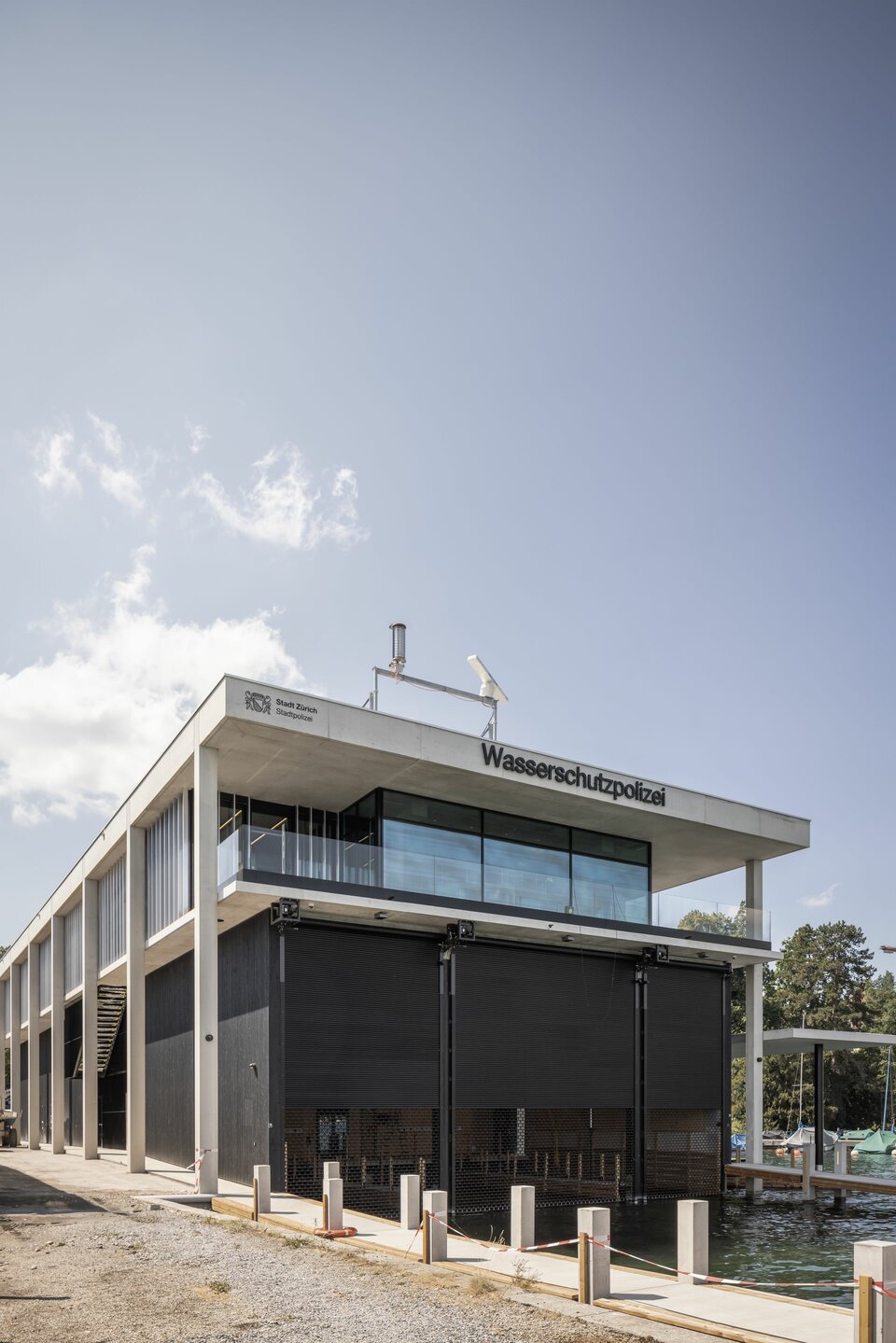 Alles im Blick: Vom dreiseitig verglasten Kommandoraum der Wasserschutzpolizei am Mythenquai hat man einen optimalen Überblick über das Züricher Seebecken. Im 24-Stunden-Betrieb wird hier für die Sicherheit und Gewässerrettung auf dem See gesorgt sowie Umweltdelikten im gesamten Stadtgebiet nachgegangen. Auch in der Gestaltung des dreigeschossigen Neubaus achtete man auf freie Sicht und klare Architektur. Die ARGE aus e2a Architekten und b+p Baurealisation orientierte sich in der Planung an der Optik der typischen Landungsstege vor Ort.