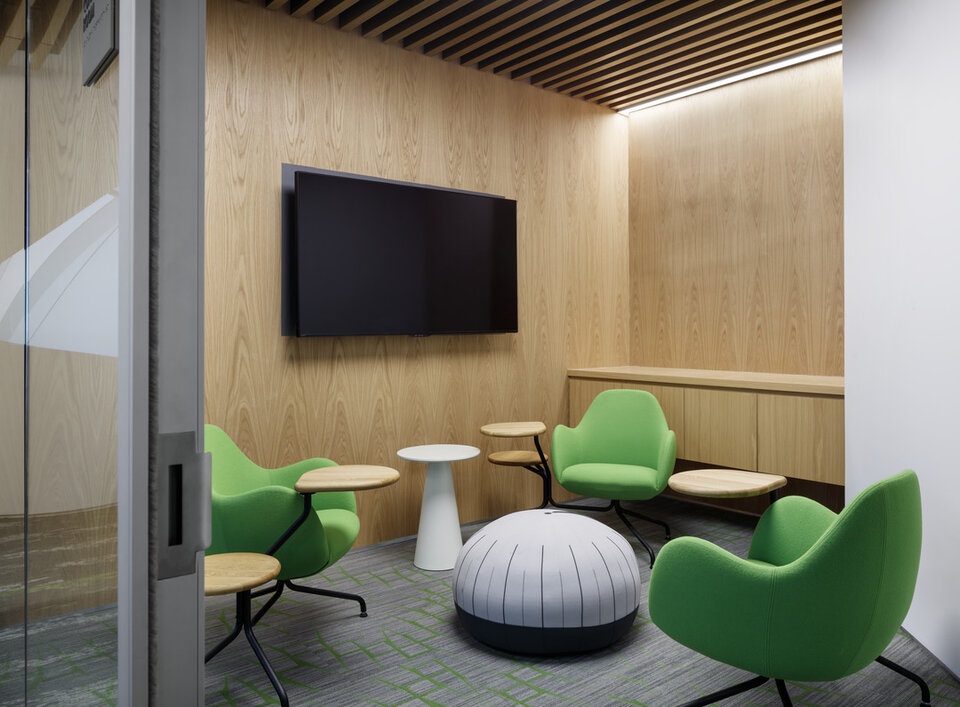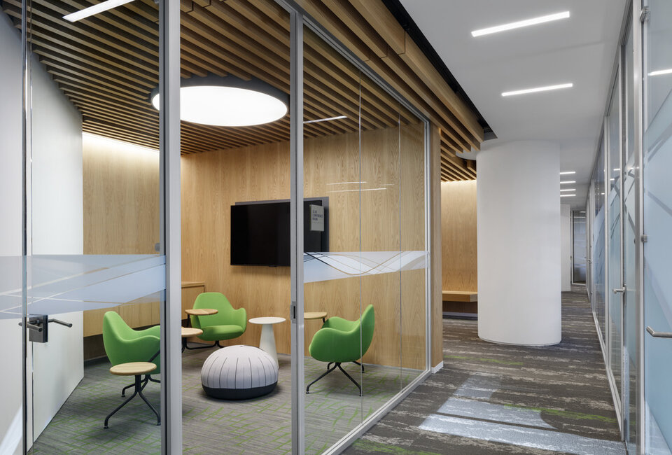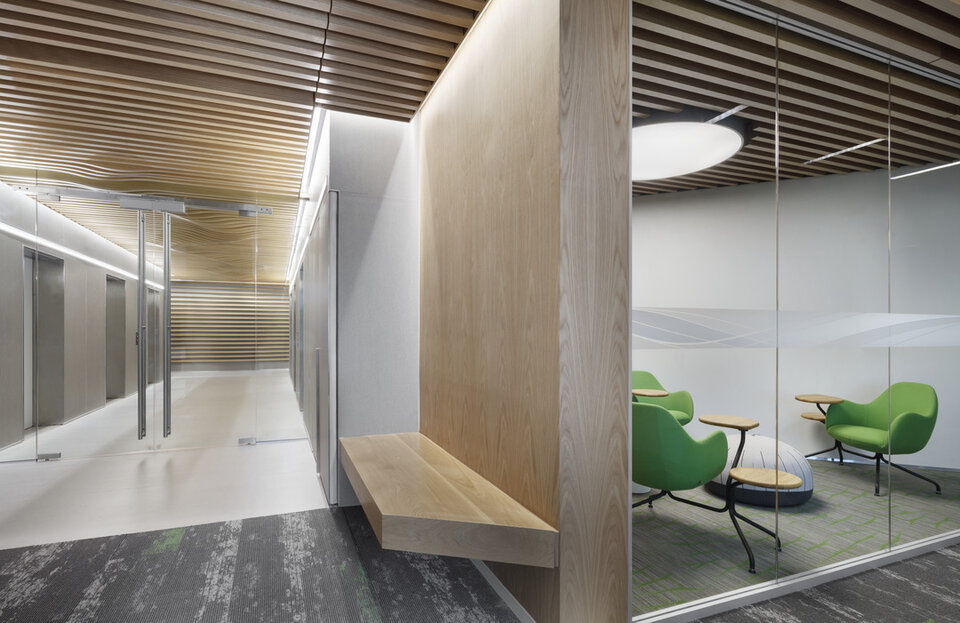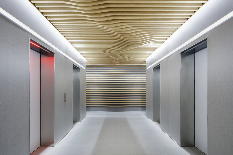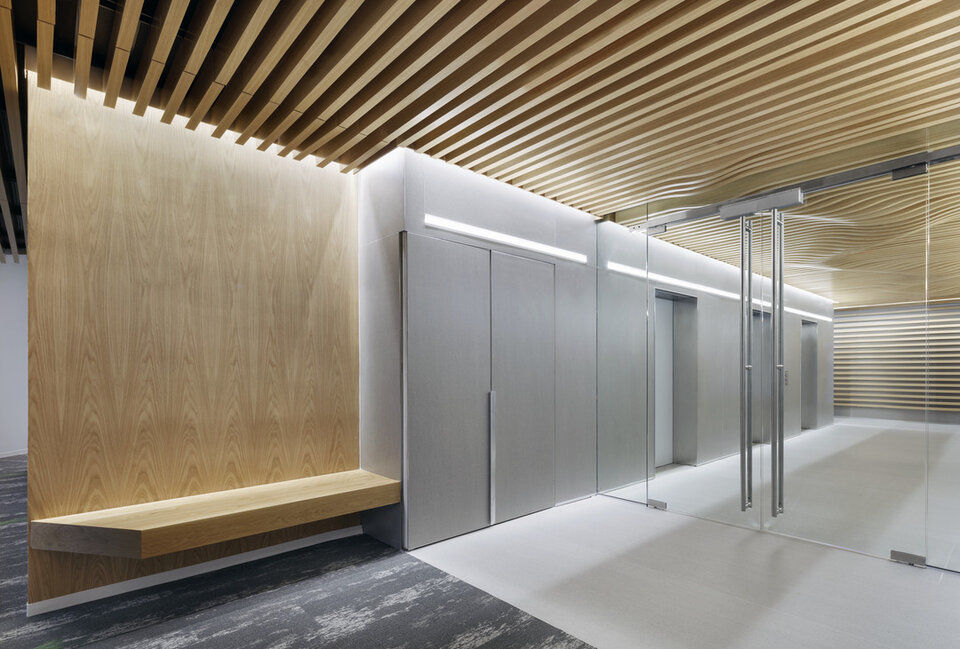 Die gewölbte Lamellendecke von Lindner mit Echtholzfurnier unterstreicht das neue Bild der interfunktionalen Synergien bei Wells Fargo Tyson's Corner. Eine einzigartige Raumatmosphäre und verbesserte Akustik wurden zudem durch das Deckensystem gewährleistet.