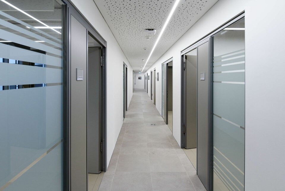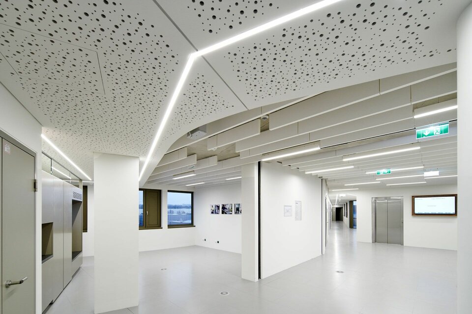Im Auftrag der Fa. Handler war die Lindner GmbH als GU für den Innenausbau nicht nur für den Trockenbau verantwortlich, sondern lieferte und montierte Doppel- und Hohlbodensysteme mit verschiedenen Oberbelägen. Im Erdgeschoss wurde zum Beispiel ein Schwerlastboden mit italienischem Steinapplikation gewählt, genauso findet sich Echtholzparkett oder Linol in den unterschiedlichen Räumlichkeiten, in den Sanitärräumen wiederum kamen die Bodensysteme als Hydro-Ausführung zum Einsatz. Um die Büroflächen akustisch aufzuwerten, installierte Lindner 2.500 Stück Deckenbaffeln. Einzelne Büros wurden durch Glastrennwände Life pure inkl. passenden Türen abgetrennt.