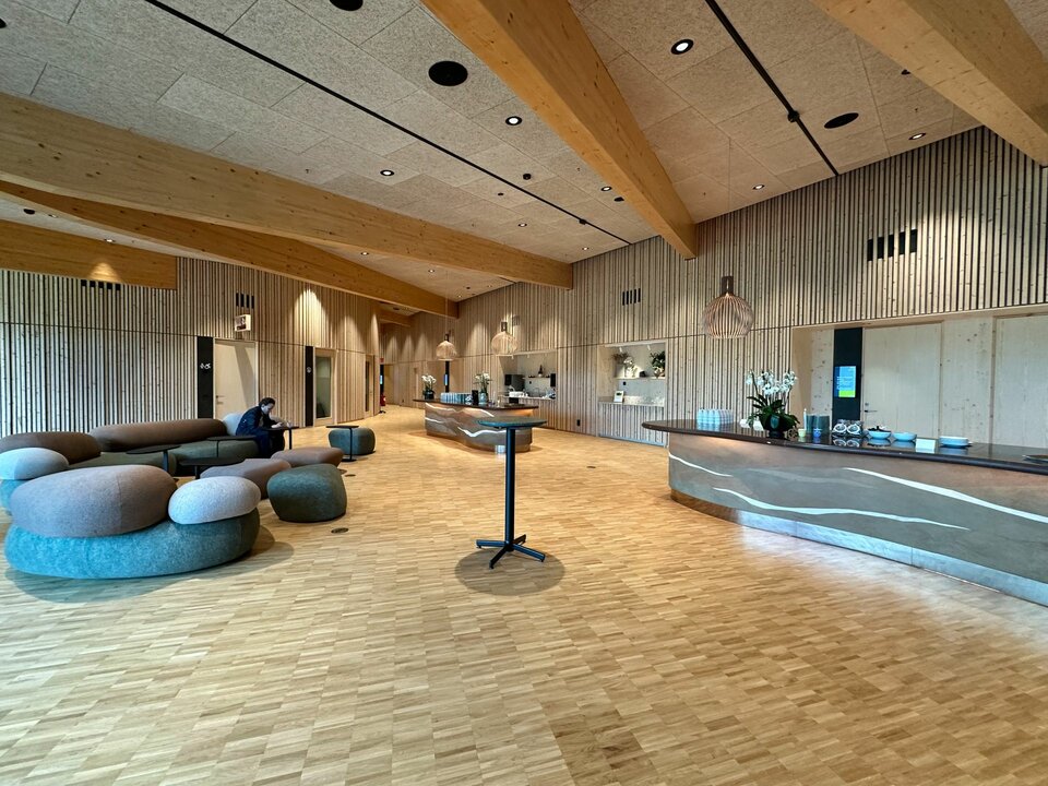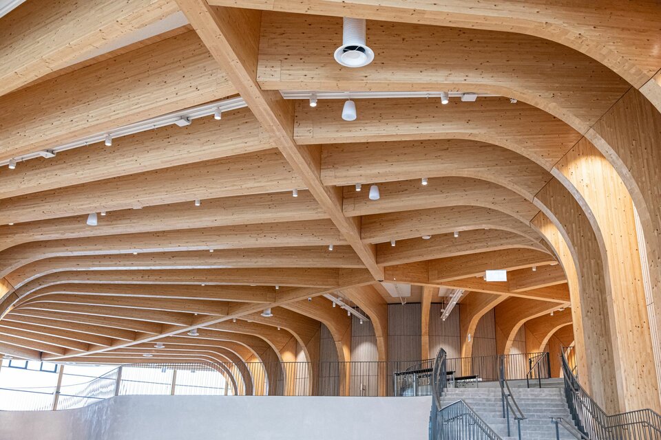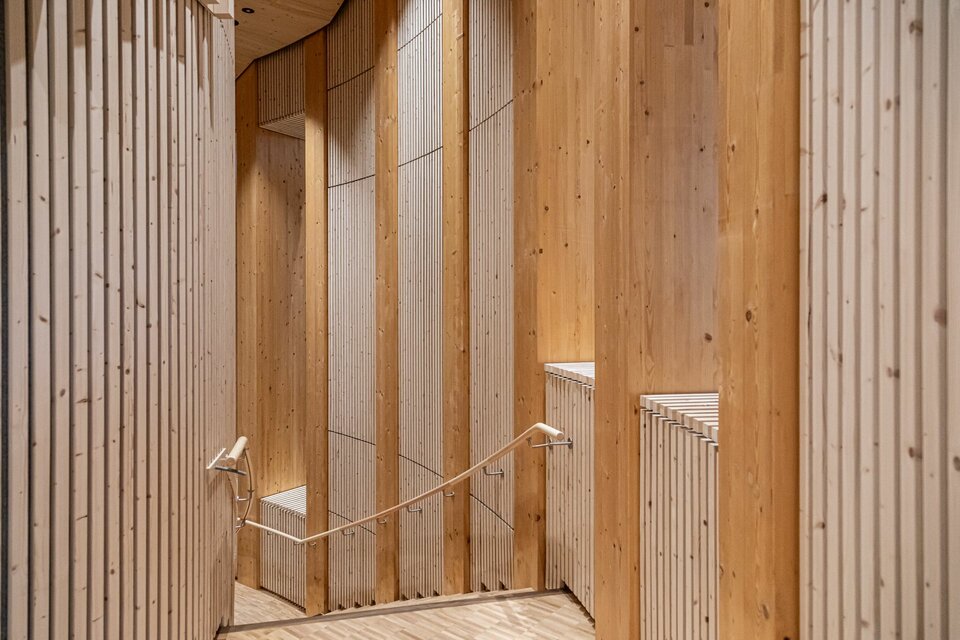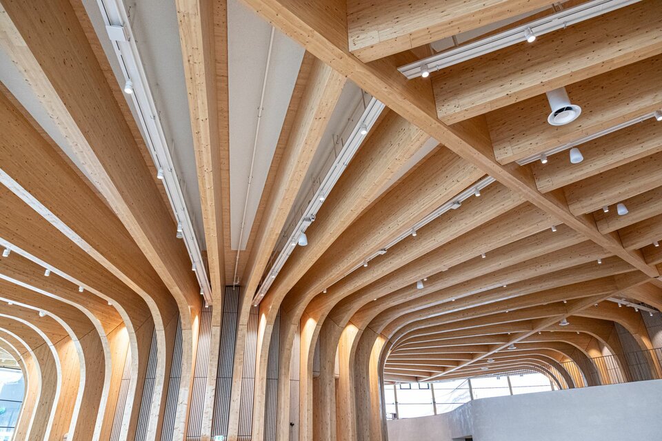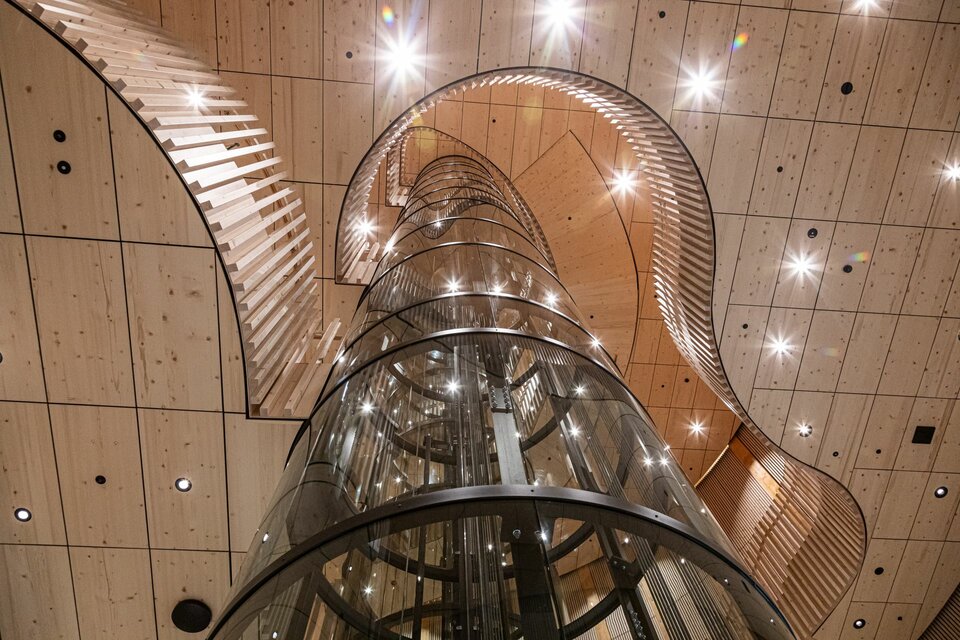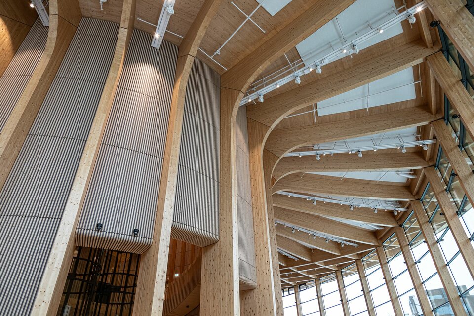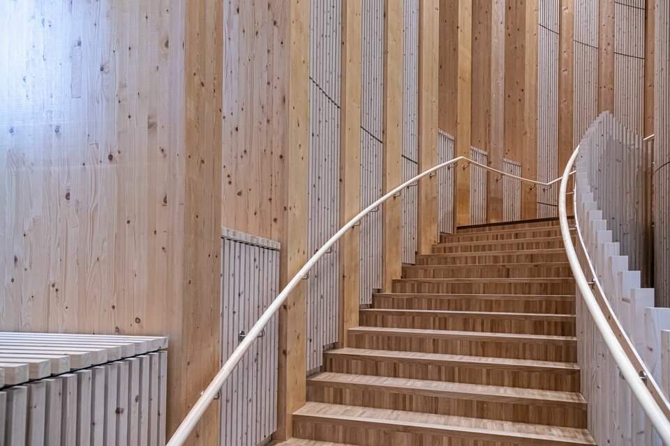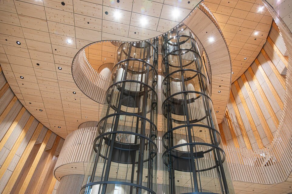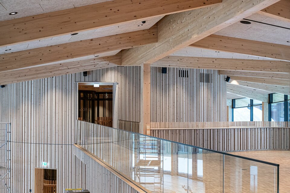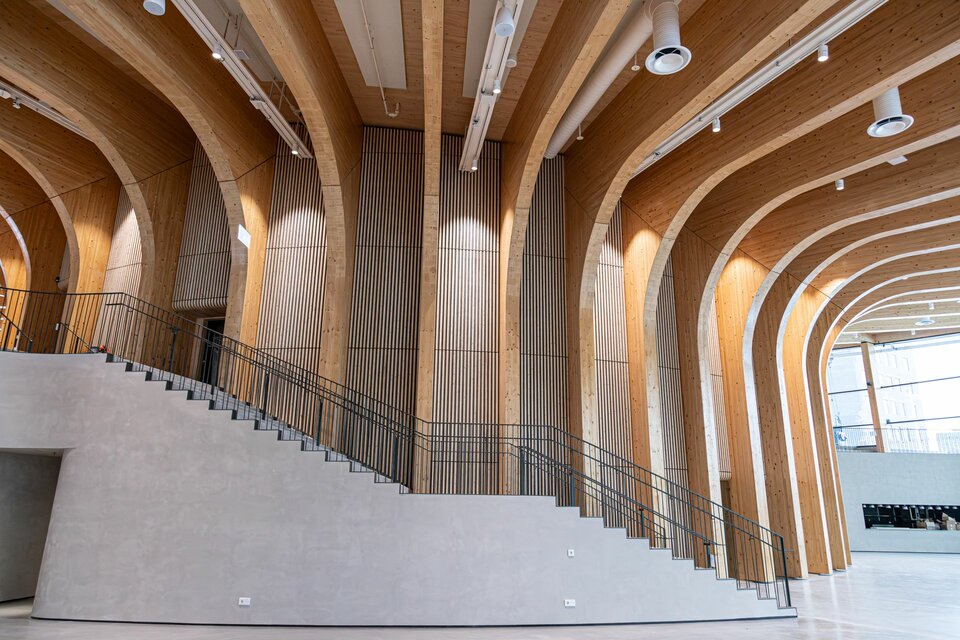 Lindner spielte eine entscheidende Rolle bei diesem visionären Projekt: Die Hauptstruktur – bestehend aus der Haupt- und Pavillonfassade sowie der Dachkonstruktion – wurde vollständig aus Brettschichtholz gefertigt und unterstreicht damit den nachhaltigen Projektansatz. Im Inneren setzt sich die Holzkonstruktion mit 3.000 m² Akustikpaneele zwischen den Hauptsäulen und Wandverkleidungen fort. Diese überzeugen mit besonderer Ästhetik und gewährleisten eine optimale Akustik im Erlebniszentrum. Lindners kreative Lösungen umfassten zudem spektakuläre Wendeltreppen mit Balustern sowie abgehängte Holzunterdecken. Die Planung des gesamten Projekts erfolgte in 3D, um alle Installationen und Verbindungen präzise zu überprüfen. Die Gestaltung der Akustikpaneele war dabei besonders herausfordernd, da die Abstände zwischen den Säulen in den Baumstämmen variierten und die Konstruktion durch zusätzliche Lasten komplexer wurde.