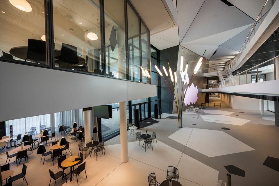 Ein besonderes Innenausbau-Highlight stellen dabei die projektspezifische Wandbekleidungen der Lindner Group im Boulevard des Gebäudes dar: bestehend aus fünfeckigen Tafeln, erinnert das Design der Wandbekleidung an die Wabenstruktur eines Fußballs. Mehr als 300 Stück wurden hierfür von Lindner verbaut und um zwei LED-Bildschirme in den Wandflächen ergänzt. Die hochwertige Metalltäfelung unterstreicht dabei die auf den Bildschirmen gezeigten Momente des deutschen Fußballs. Weitere goldfarbene und mit Folierungen versehene Metallwandbekleidungen geben Besucher heute außerdem einen Überblick über den DFB und seine Mitgliedsverbände. Abgerundet wird der moderne Charakter der Akademie mit Lindner Wandbekleidungen aus grauem Metall in den Gangbereichen rund um den Aufzügen im Boulevard des Campus.