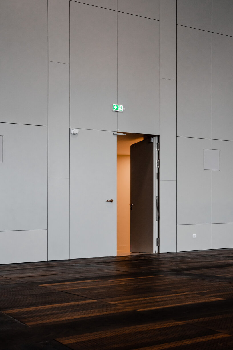 Neben der Optik erfüllen die Türen ebenso zahlreiche bauphysikalische Anforderungen. So unterliegen kulturelle Gebäude unter anderem der Pflicht, bestimmte Brandschutzauflagen zu erfüllen, um sowohl Personen als auch das Gebäude im Brandfall zu schützen. Die verbauten Türen verhindern dank Rauchschutz und Brandschutzklasse T30 die schnelle Ausbreitung des Feuers. Darüber hinaus erfüllen die Lindner Brandschutztüren mit einer Türblattstärke von 68 mm die Rettungsweganforderungen nach DIN EN 179 und können demnach problemlos in Flucht- und Rettungswegen eingesetzt werden. Für zusätzlichen Komfort für Besucher und Personal wurden die Türanlagen darüber hinaus als Festanstellanlage oder zum Teil mit automatischen Antrieben versehen. Für ein ebenmäßiges Erscheinungsbild, in Kombination mit den Wandbekleidungen, wurden die Türen teils mit Aufdopplungen versehen. COMPlacq acoustic mit einer Mikroperforation von 0,4 mm sorgt dabei für Design, Schallabsorption und Nichtbrennbarkeit.