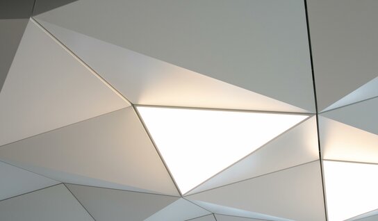 TRIdesign verbindet gleiche Module mit einer Größe bis zu 1.250 x 1.250 mm – aus der unterschiedlichen Anordnung ergibt sich letztlich ein kreatives und zugleich einzigartiges Design. Die Kombination mehrerer Hoch- und Tiefpunkte bildet schließlich das charakteristische Dreiecksdesign. Unabhängig von der 3D-Geometrie der Decke ermöglicht die planebene Unterkonstruktion zudem eine einfache und werkzeuglose Montage.