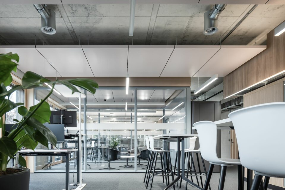 Der Lindner Cube, ein weiteres Raum-in-Raum System der Lindner Group, ermöglicht die Realisierung großer Raumgrößen und zeichnet sich durch hervorragende Schalldämmung sowie die Option zur Integration von Kühlung aus. Beide Systeme ermöglichen konzentriertes Arbeiten in offenen Bürostrukturen und bieten exzellente Schalldämmung. Zusätzlich verbessern die flexiblen Schallabsorber MUTE+® für Decken und Wände die Sprachverständlichkeit und verkürzen die Nachhallzeit, besonders in Großraumbüros.