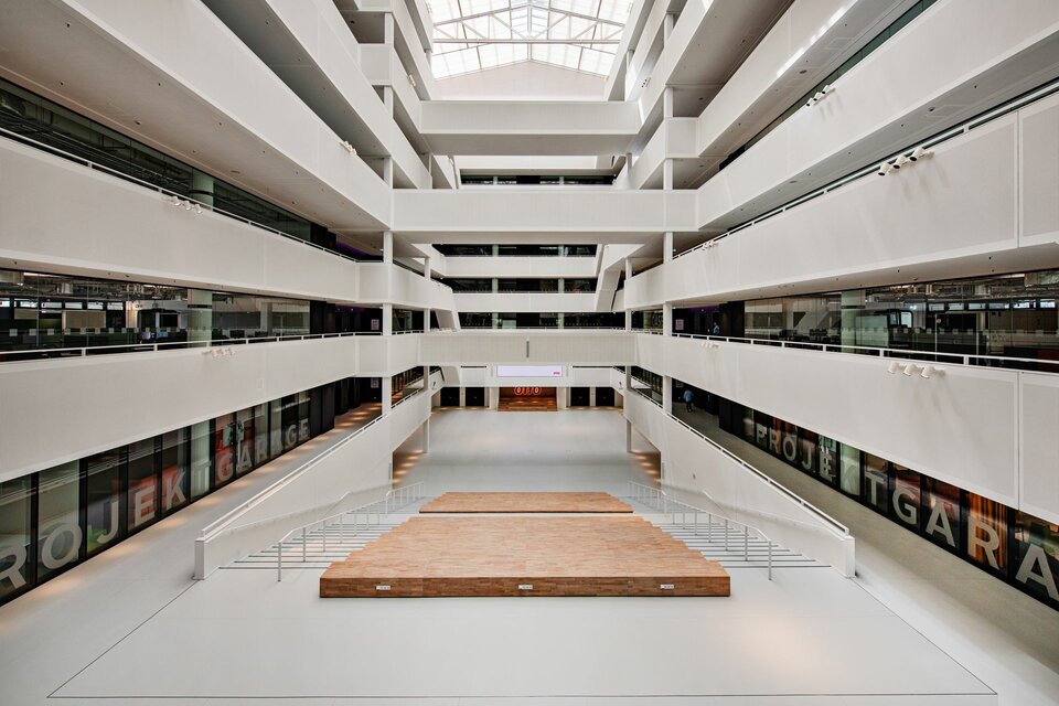 Die Neuerschaffung des ehemaligen Logistikgebäudes hin zum OTTO Headquarter umfasste neun oberirdische Stockwerke sowie ein Untergeschoss mit einer beeindruckenden Bruttogrundfläche von rund 47.900 m². Eine architektonische Besonderheit des Projekts ließen sich die Architekten von akyol kamps mit dem nachträglich hineingefräßten Atrium einfallen. So entstand eine außergewöhnliche offene, lichtdurchflutete Atmosphäre und eine besondere Begegnungs- und Veranstaltungsstätte, zusätzlich zu den offenen Bürowelten.
