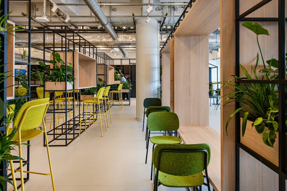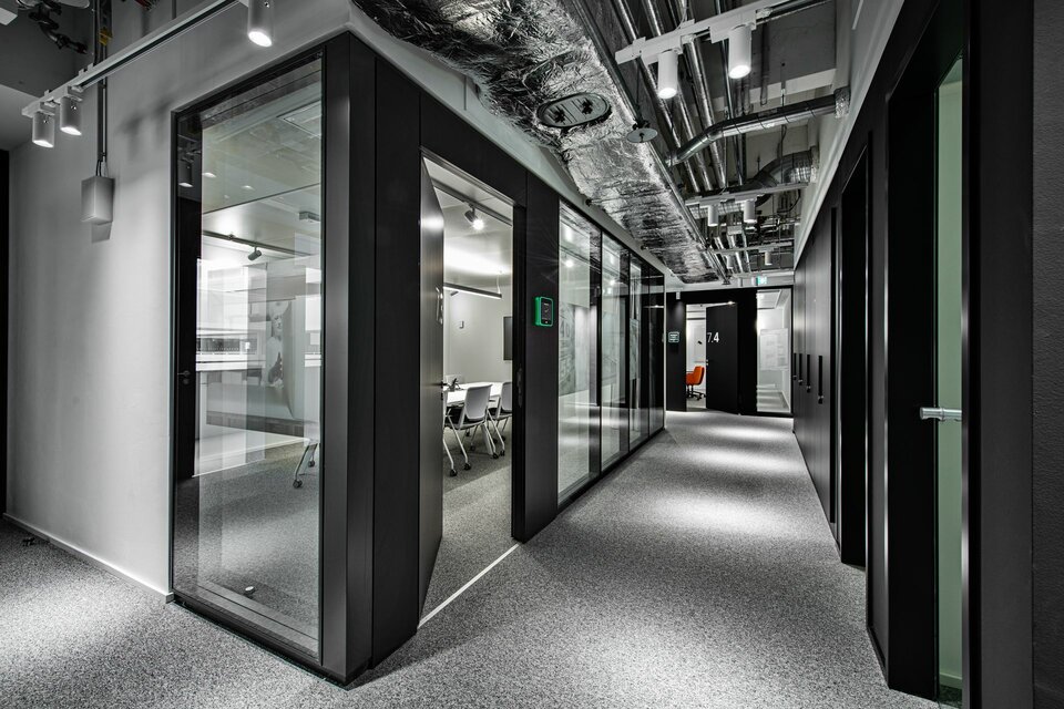 Materialien wie Glas und Metall sowie freigelegte Betonsäulen, teils bis zu 30 m hoch, verleihen den Flächen einen klaren Industriecharakter. Das monochrome Design, dominiert von Schwarz und Weiß, wird durch punktuelle farbliche Akzente aufgelockert, was den minimalistischen, industriellen Stil unterstreicht.
